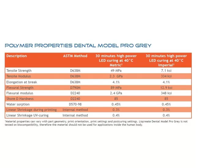 Liqcreate Dental Model Pro Grey ir matēts, necaurspīdīgs fotopolimērs ar pelēku krāsu. Matētā virsma izceļ modeļu dziļumu un detaļas, sniedzot lielisku skatu uz iegriezumiem, un virsma ir ideāli piemērota izdruku skenēšanai. 3D drukātām detaļām no šī materiāla ir izcila izmēru stabilitāte un zema saraušanās drukāšanas laikā, padarot tās ideāli piemērotas zobu modeļu ražošanai un iztaisnošanas kapu modeļiem.Liqcreate Dental Model Pro Grey ir viegli lietojams atvērtos SLA, MSLA un DLP 3D printeros 385-420 nm diapazonā.