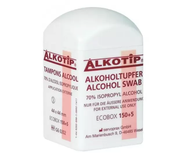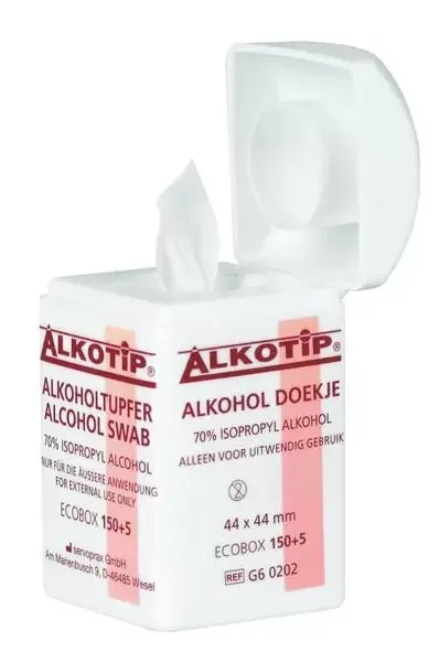 Alkotip Alcohol swabs in a DispenserAlcohol wipes with 70% isopropyl alcohol.