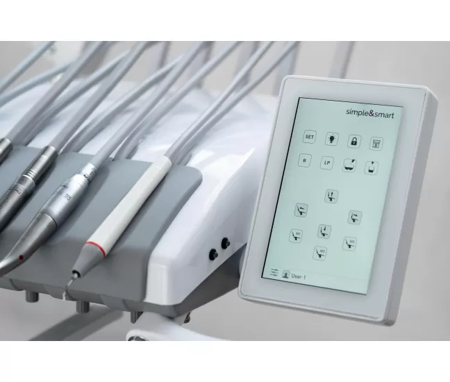 Control panel on instrument tray: 3 programmable positions (trendelemburg position + reset position + last working position). Light control, basin control and programmable glass filling control, water boiler activation, x-ray viewer activation. chair movement controls.