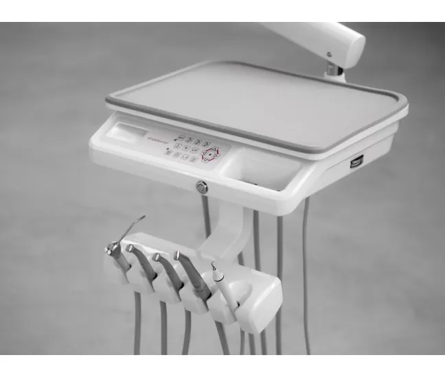 Control panel on instrument tray: 3 programmable positions (trendelemburg position + reset position + last working position). Light control, basin control and programmable glass filling control, water boiler activation, x-ray viewer activation. chair movement controls.