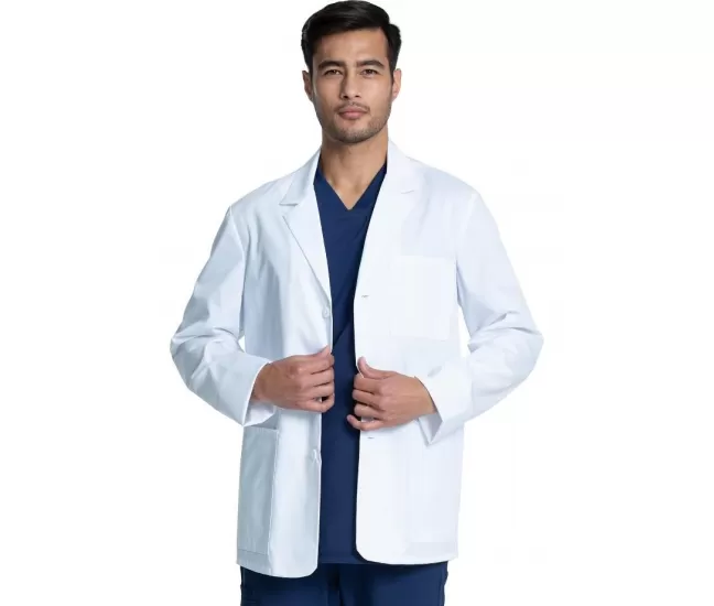 Men's Consultation Coat CKE401 in WhiteThis Men's Modern fit consultation length lab coat has notched lapels, a three button front closure, back yoke seam and center back seam.