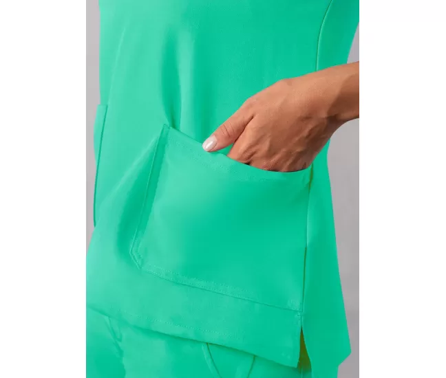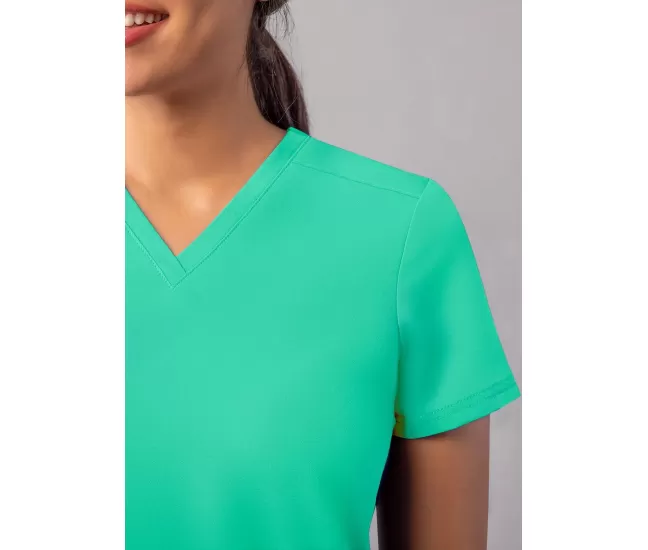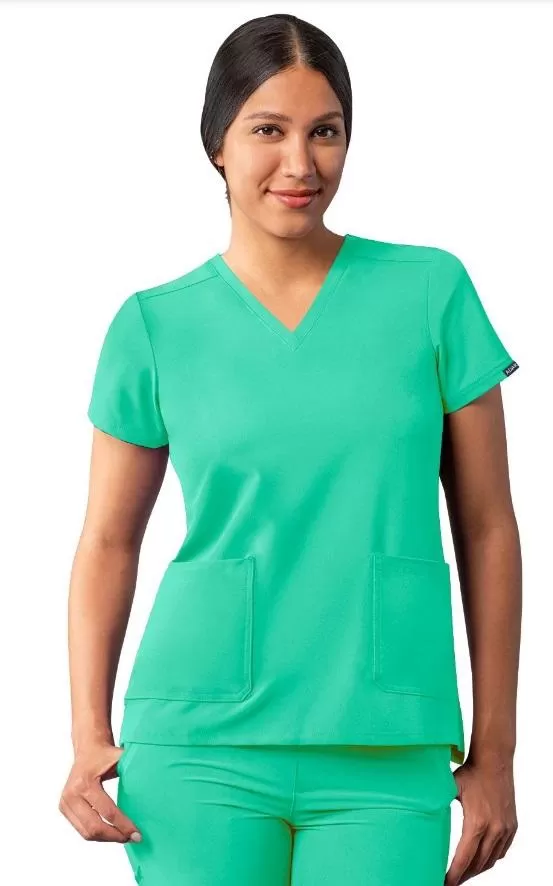 The back darts at the center back gives this top it’s slimming shape while the enhanced details such as the forward shoulder and back yoke and ADAR brand icon on the back gives this style a modern look.