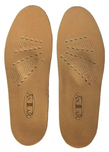 Orthopedic leather insoles against transverse and longitudinal flat feet - cushioning AT53502The bottom of the insoles is made of foamed latex with appropriate hardness and elasticity, without permanent deformation. The insoles have a profiled supinating wedge proportional to the size of the insole and the metatarsal pad, the size of which depends on the length of the foot. The insoles gently support the arches of the foot - longitudinal and transverse. In the heel part, they have a recess that functions as foot stabilization. In the front part of the insoles, there is a perforation that allows the air to circulate calmly inside, which also causes a gentle foot massage. They are recommended for longitudinal and transverse flat feet. They absorb shocks, soothe ailments and pain in the sole area of the feet. The insoles do not take up much space in the footwear and improve the comfort of walking.