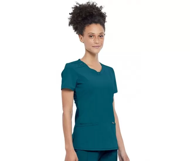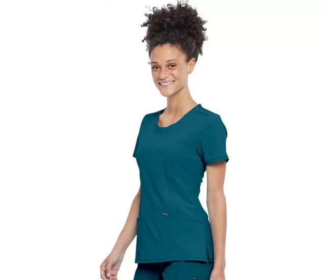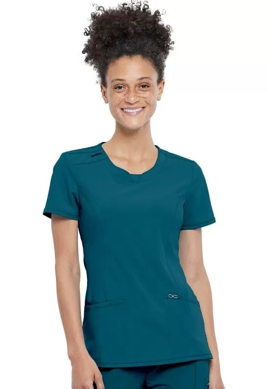 Round Neck Top CKE2624A in Caribbean BlueA Contemporary fit round neck top with a rib-knit inset at the front neckband also features shoulder yokes, a bungee ID badge loop on the right shoulder, front and back princess seams, two patch pockets, one interior pocket, and side vents.