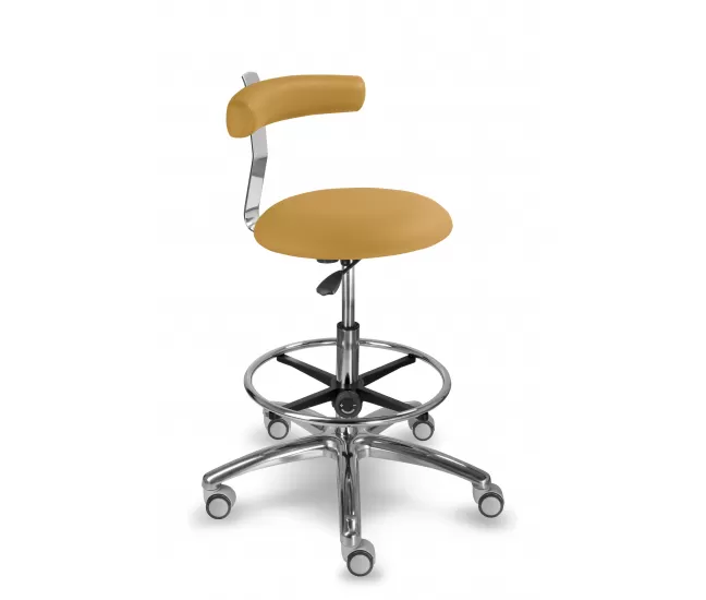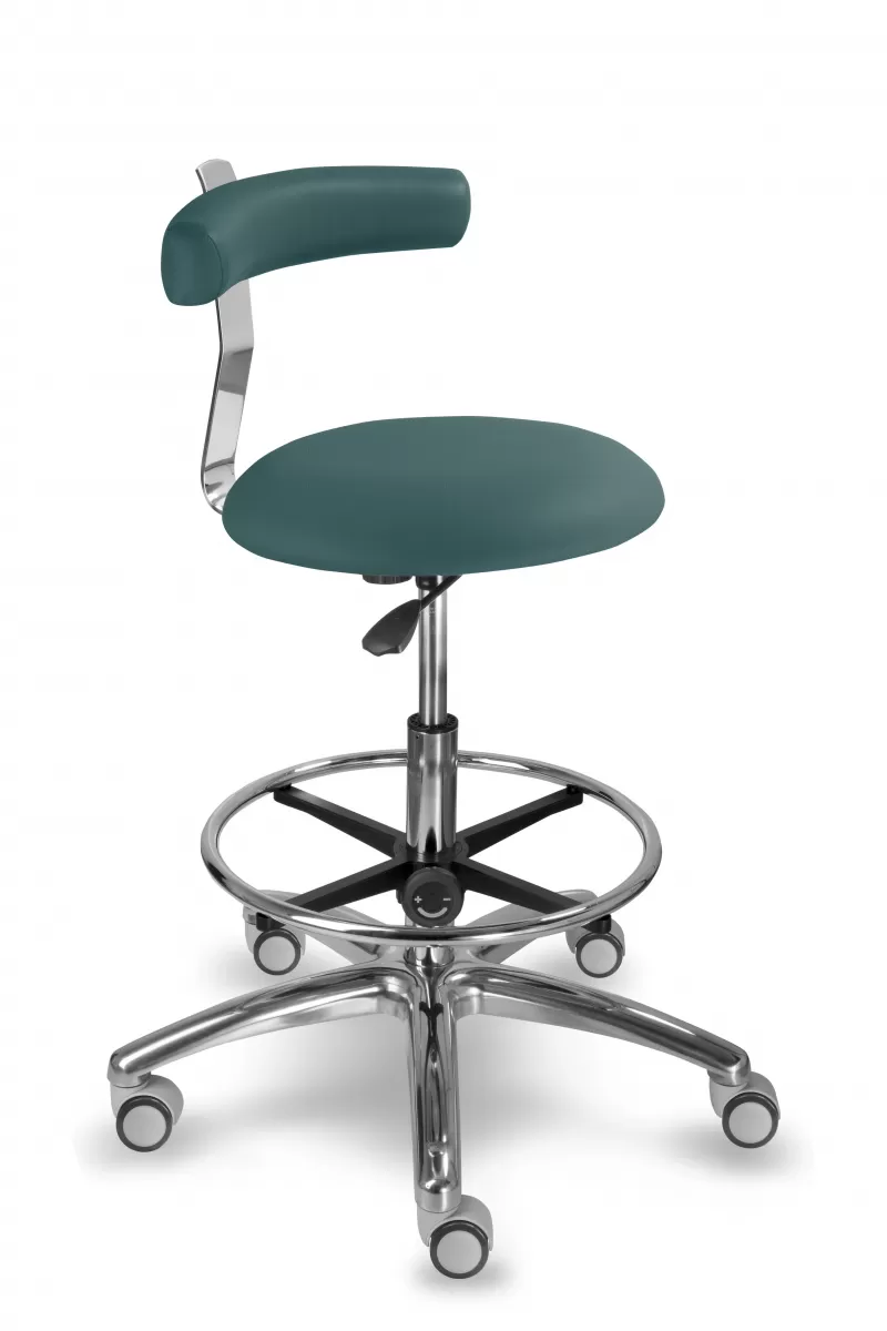 Saddle chair with wheels, backrest and footrest 1240GDentThe height of the seat, footrest and backrest is individually adjustable.