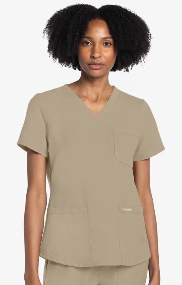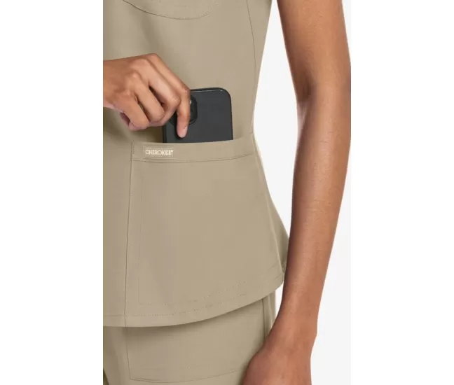 Women's 3-Pocket V-Neck Shirttail Scrub Top CK961A KhakiA classic you’ll wear on repeat. The Women’s 3-Pocket V-Neck Shirttail Scrub Top from Ultra by Cherokee Workwear delivers everyday function with a polished fit. A subtle crossover neckline and shirttail hem give it a clean, flattering shape, while three patch pockets keep your essentials close at hand. Finished with decorative topstitching and a tonal logo label, it’s made in performance polyester with breathable stretch, moisture control and PROTX2® odor-fighting technology—so you can count on comfort that lasts through every shift.