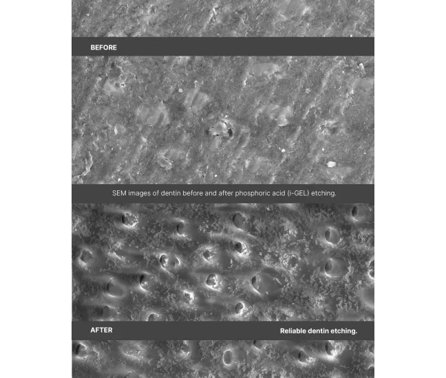 37% fosforskābe efektīvi noņem līmes slāni un atver dentīna kanāliņus, tādējādi radot ideālus apstākļus spēcīgai saķerei;