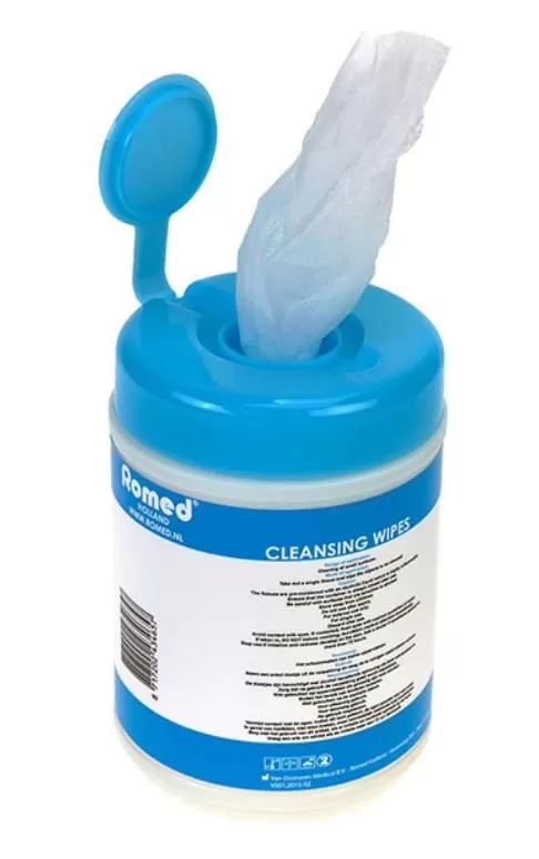 Non-woven (thermbond) impregnated cleansing wipes in a dispenserFabric: non-woven (thermbond) impregnated.