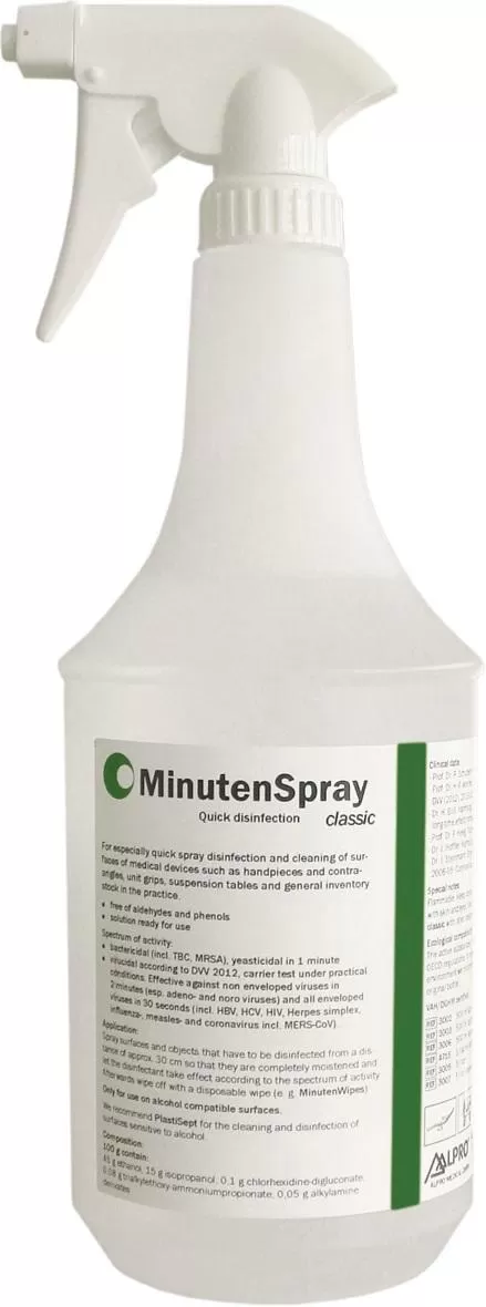 MinutenSpray classic, 1 ltr.Aldehyde-free and phenol-free quick-acting disinfectant ready for use for surfaces of medical devices e. g. turbines, contra-angles and hand pieces, unit grips and suspension tables; contains active cleaning ingredients. Approved and recommended amongst others by Sirona Dental.