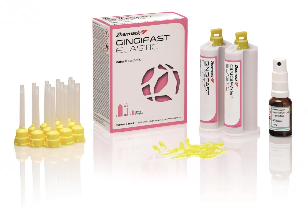 Package: 2 x 50 ml cartridges + 1 Gingifast Separator bottle 10 ml + 12 yellow mixing tips + 12 yellow intraoral tips + 1 spray.