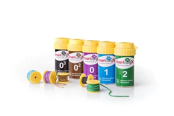 Smartcord X is a knitted retraction cord, made of 100% cotton, impregnated with Aluminum Chloride Hexahydrate 1.2±0.8 mg per inch of cord.So it is very effective in temporary gingival retraction and hemostasis of the gingival margin. Aluminum Chloride is most popularly used chemical reagents, and least irritating of all the medicaments used for impregnating retraction cords.