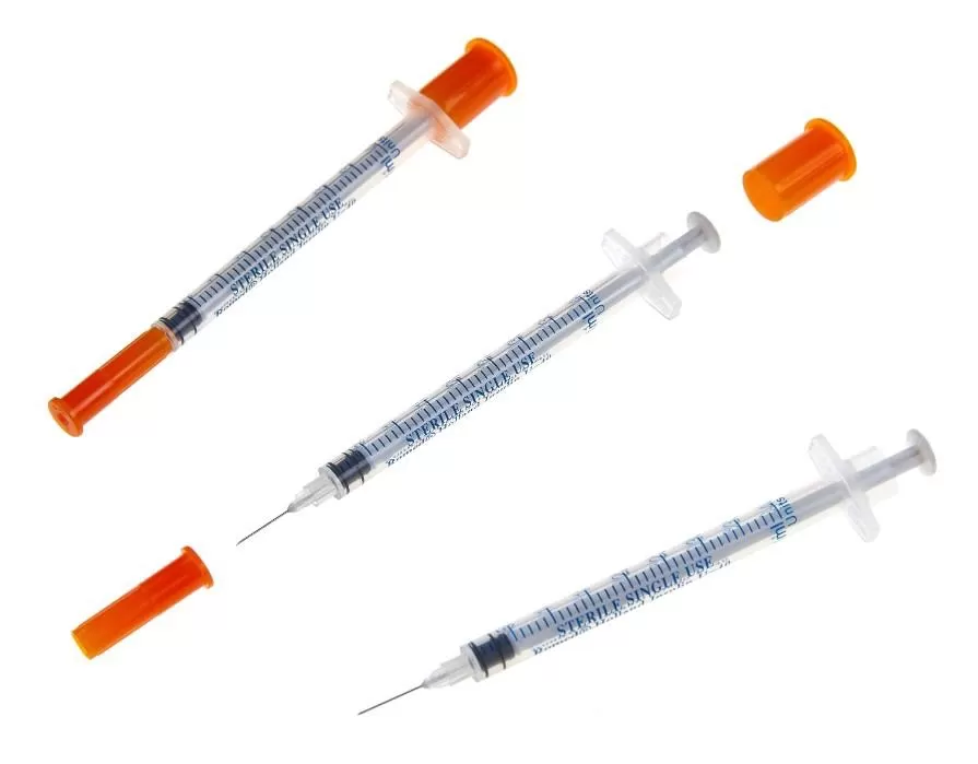 Disposable insulin syringes with fixed (integrated) needle.