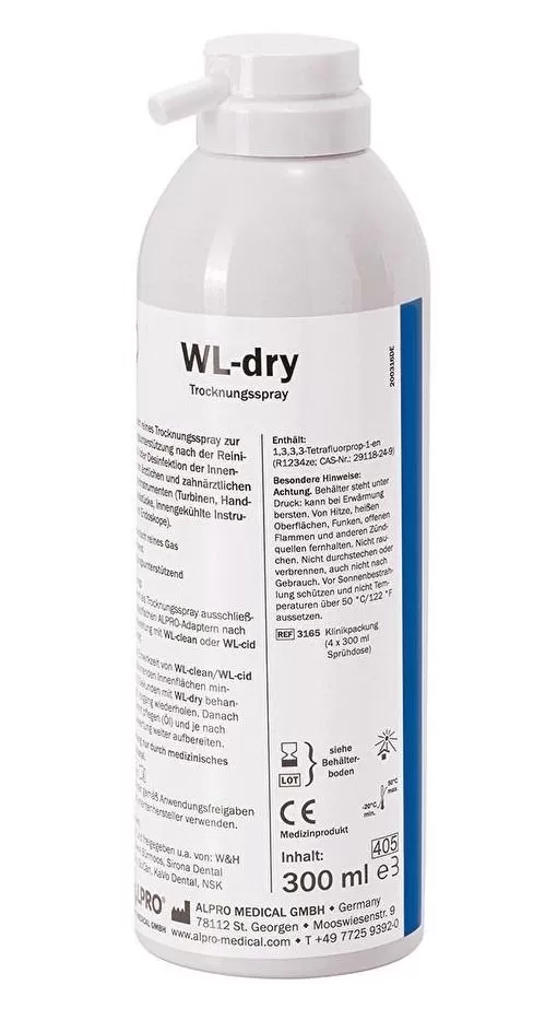 WL-dry tool for drying nozzlesMedically purified dry air spray for rapid drying of hollow and dental instrument parts such as turbines, tips, internally cooled instruments and endoscopes after application of WL clean and WL cid. Quick drying of channels and surfaces. After use, the instruments can be used immediately.