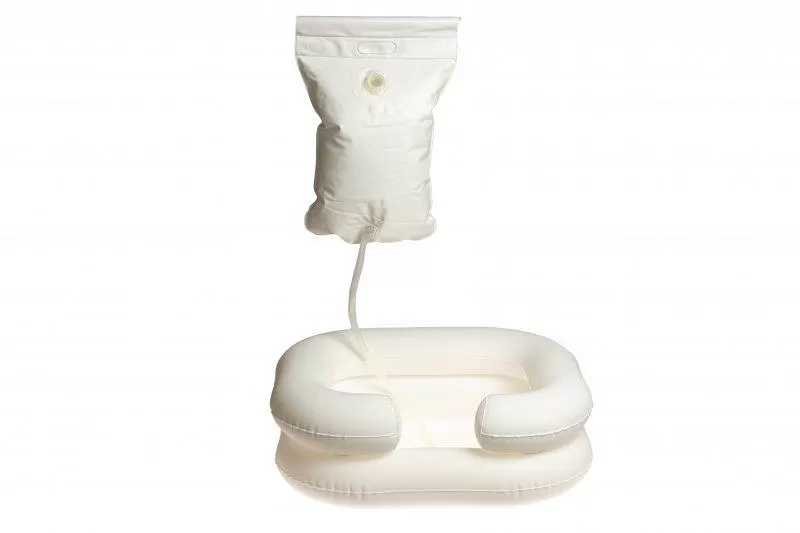 Bathtub for washing the head, inflatable, 10LDouble-reinforced, 20 cm deep container, providing a more durable base for even more convenient use. This tub also has a drain valve and a hose that lets used water out easily and quickly. Also, if there is no access to a water source, the product has a portable shower with a maximum capacity of 10 liters. The product is inflated using the pump included in the kit. The inflatable wash basin is designed for washing hair in bed or in a chair.