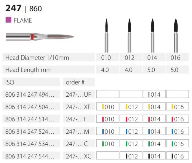 Diamond bur 247/860 for turbine handpiece, (the price is for 1 piece, in a package of 5 pieces)