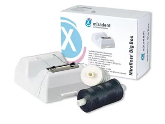 Mirafloss Big Box with 2 spoolsWall-mountable dispensing box.