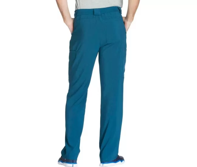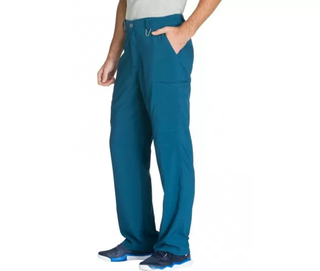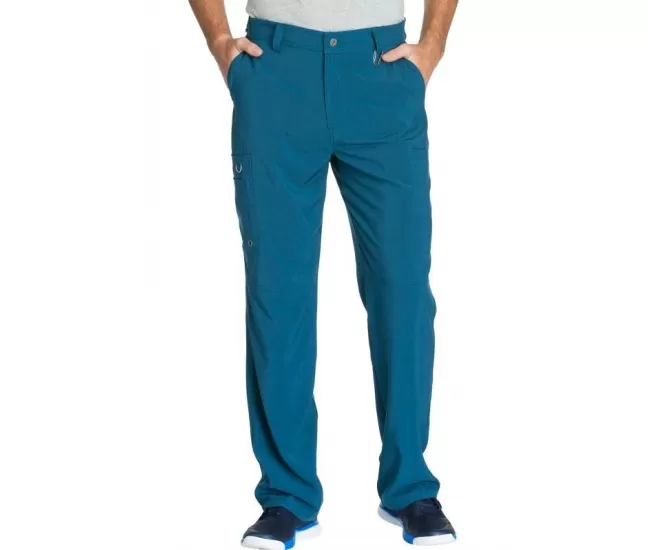 Men's Fly Front Pant CKE200A in Caribbean BlueA Men's Modern fit tapered leg pant features an inside functional drawstring, back elastic waistband with rib-knit, five belt loops, a zip fly with button closure and a hidden inseam gusset for extra ease.
