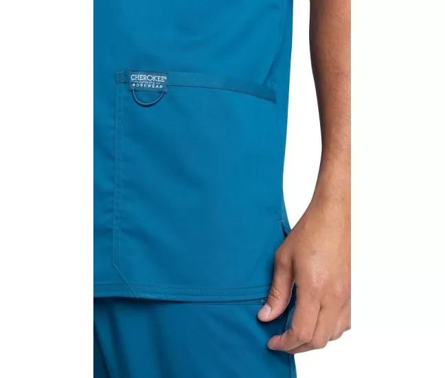 Medicīniskā blūze WWE670 Caribbean BlueVīriešu medicīniskā blūze ir izgatavota no īpaši mīksta un elastīga materiāla, kas sastāv no 78% poliestera, 20% viskozes un 2% elastāna, 170 g/m², nodrošinot lielisku izskatu, komfortu un vieglu kopšanu.