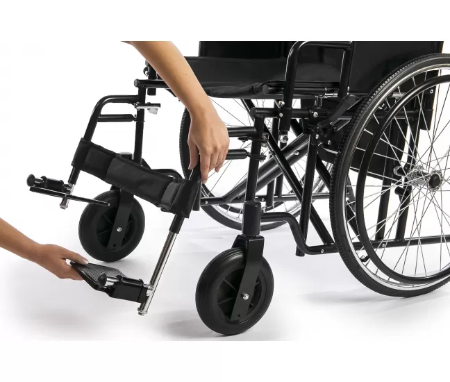 The universal, particularly strong and reliable heavy-duty wheelchair STEELMAN XL is designed for people weighing up to 180 kg, who have temporary or long-term mobility problems. The stroller is adapted for use both indoors and outdoors, for independent movement by rotating the metal drive hoops located near the rear wheels. The stroller can also be driven by an attendant using push handles mounted above the backrest.