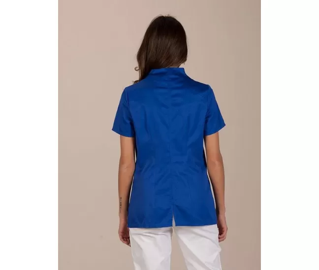 Elegant close or adherant fitting lab jacket with great attention to the details around the collar and shoulder area of the coat.