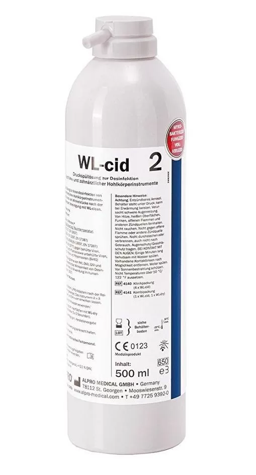 Usage: After cleaning with WL-clean, rinse the instrument through a suitable adapter for >3 s with WL-cid and let the effectiveness activate for 2 min. After that, dry with WL-dry (>3s) and lubricate with lubricants according to the manufacturer's instructions.