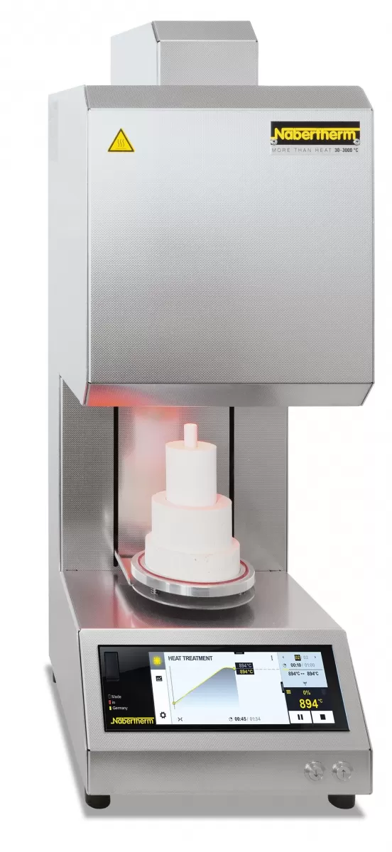 The vacuum pressing furnace VL 01/12 LB Press is ideally suited for firing of conventional ceramic veneers under normal atmosphere or vacuum but also for processing of all common pressing ceramics. The all-round heating of the furnace chamber results in a very even temperature uniformity and enables fast heat-up times. The lowerable, electric motor-driven lifting table ensures easy and convenient handling for the pressing process.A highlight is the especially developed controller D580 with colourful, high-contrast 6.8 inch touch display. It enables intuitive programme input on the large touch screen. Programs can be displayed graphically and in tabular form. The vacuum pressing furnace is freely programmable. Many manufacturer programs can be downloaded free of charge from the program portal on the Nabertherm website and loaded into the controller.