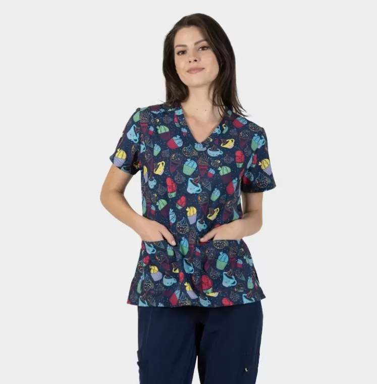 Women's Medical tunic ISABELLA, blue with cup cakeMedical tunic ISABELLA is a new model, elegant, women's tunic of the B-well brand with a modern and stylish design, fitted silhouette and ethereal fabric.