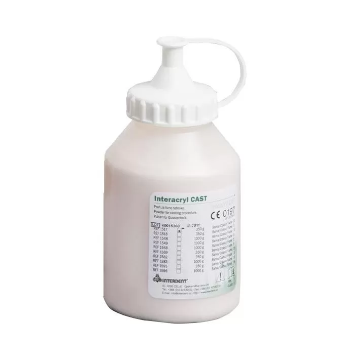 Interacryl Cast is self-curing cadmium-free methyl methacrylate based artificial material for completion of casted partial removable dentures, relining of dentures, extension of dentures and pouring technique in prosthetics (f.e. Gelcast system).Colour: pink transparent with veins.