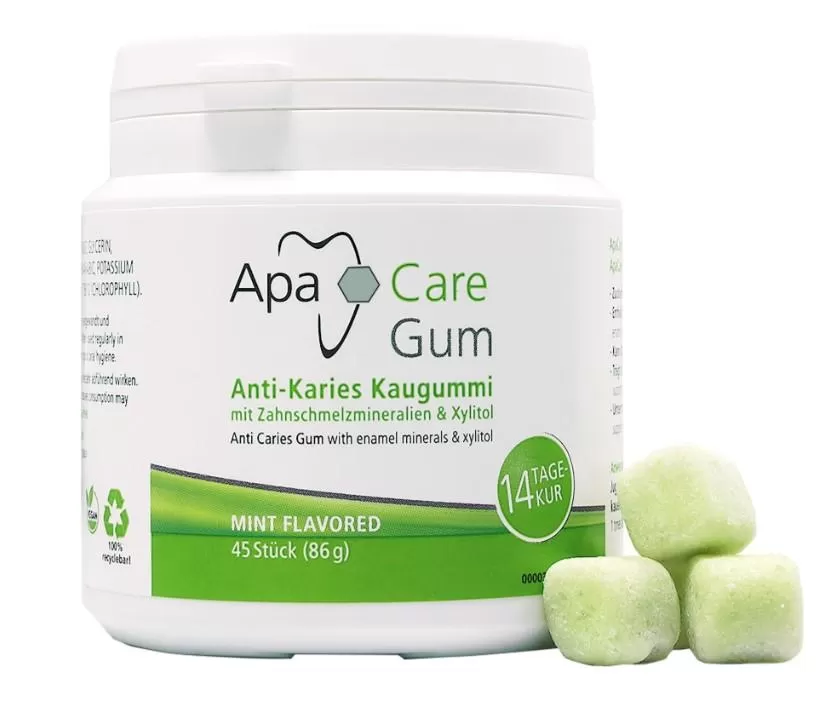 ApaCare Gum satur ksilītu, patīkamas garšas dabīgu cukura aizstājēju (tā saukto bērza cukuru) un zobu emaljas minerālvielas.