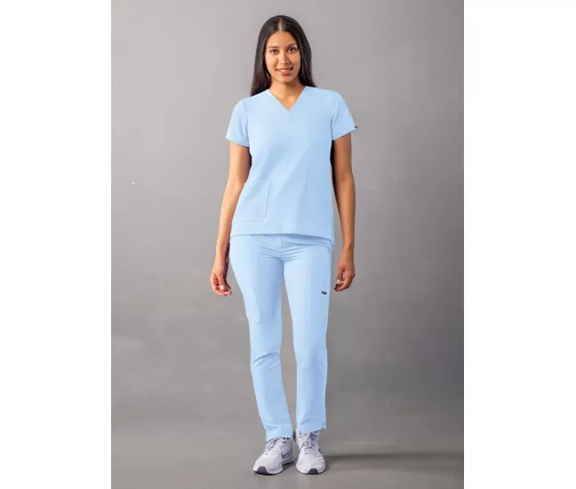 Medicīniskā blūze A6008 debeszilaMedicīniskā blūze ar īsām piedurknēm un V veida kakla izgriezumu.