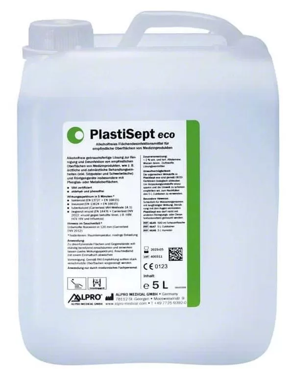 Šķīdums medicīnisko virsmu tīrīšanai un dezinfekcijai, PlastiSept eco, 5 LLietošanai gatavs šķīdums - darbojas pilnīgi bez QAC, alkohola, aldehīdiem vai fenoliem, un tāpēc tam nav alerģiskas iedarbības - jutīgu medicīnisko virsmu tīrīšanai un dezinfekcijai (medicīnas un zobārstniecības - polsterējums, galdi, rentgena ierīces, instrumenti un akrila stikls).