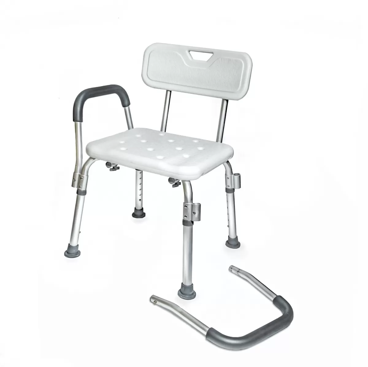 Стабильный, легко очищаемый и дезинфицирующий стул с съёмными подлокотниками может использоваться для душа, купания или просто в ванной. Он изготовлен из прочного, не скользящего пластика и высококачественного алюминия. В сиденье есть отверстия для проточной воды, удобная спинка с вырезом. Подлокотники и спинка снимаются без использования инструментов. Высота сиденья изменяется за счёт регулировки длины ног. Каждая ножка имеет отверстия для фиксации высоты.
