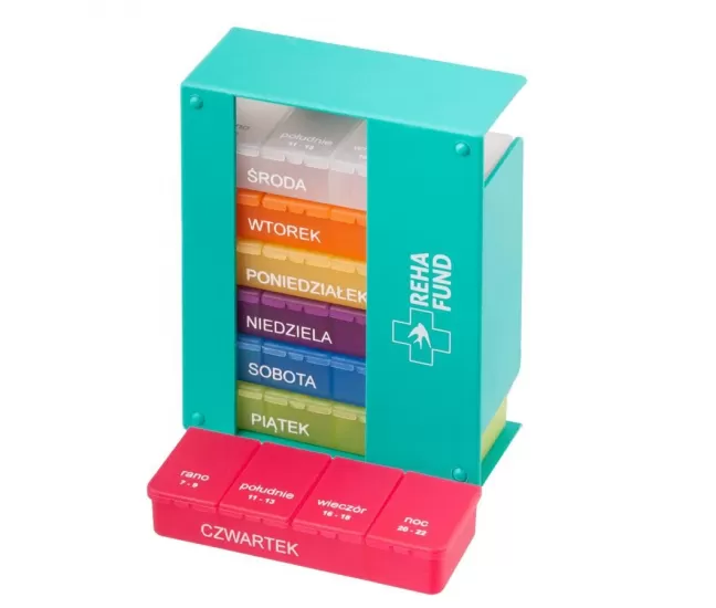 Коробка для лекарств на неделю RF-357Удобный и долговечный контейнер для использования лекарств в течение недели. С названиями недели, дней и времени суток, отмеченными разделами.
