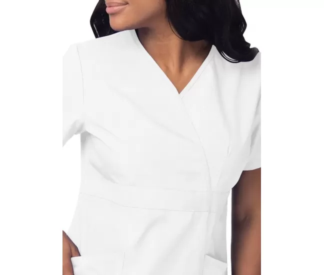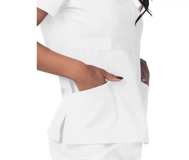 Медицинская блузка S8302 белаяВНИМАНИЕ, предупреждаем, что одежда из белых материалов с полиэстером слегка мерцает. Если вы считаете, что это вам не подойдёт, мы рекомендуем выбрать белую одежду из 100% хлопка.