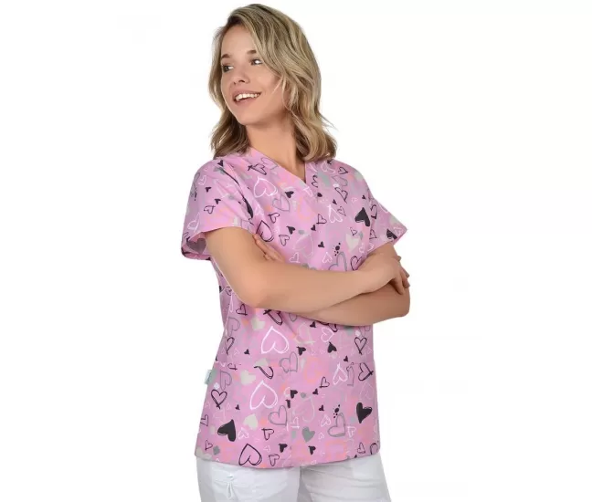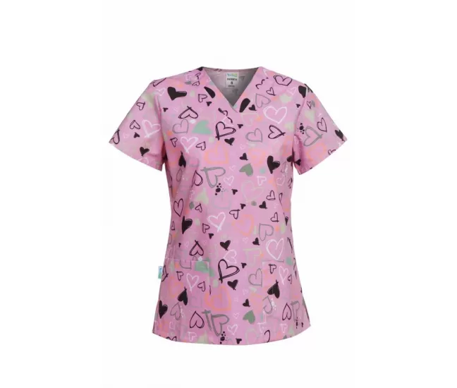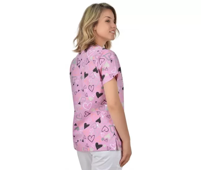 Медицинская женская блузка BAMBINA, розовая с сердечками