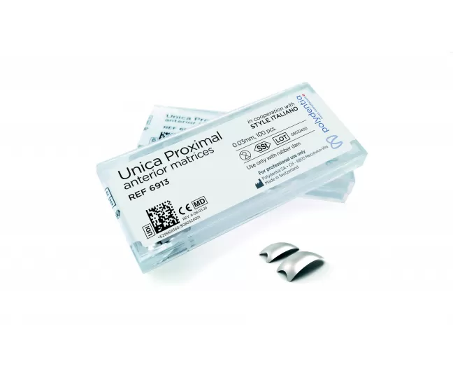Матрицы из нержавеющей стали Polydentia Unica Proximal имеют толщину 0,03 мм и имеют две формы (стандартную и глубинную), предназначенные для соответствия контуру передних зубьев лабиально, нёбной и проксимальной.