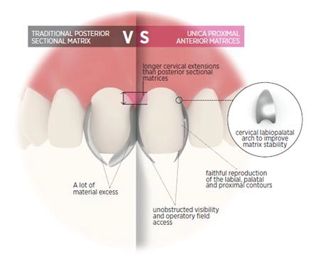 Проксимальные матрицы Unica специально разработаны для восстановления фронтальных стенок с использованием проксимальных стенок (классы III и IV, булавообразные боковые зубы, закрытие диастем, частичные и полные виниры).