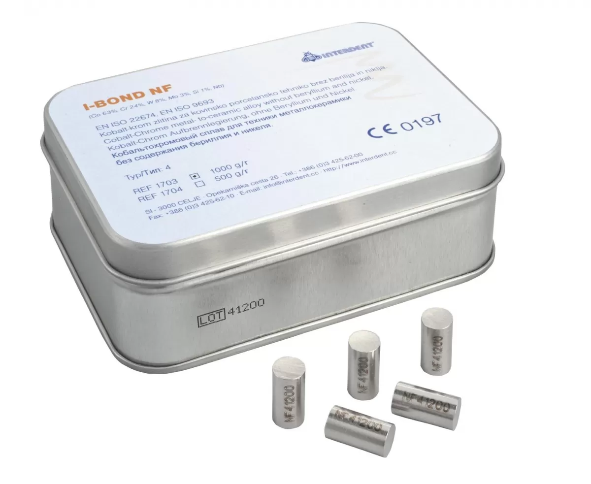 Кобальт-хромовый сплав для реставрации фарфора и металлов. I-Bond NF — это биосовместимый сплав на основе никеля и хрома. Он не содержит никеля и бериллия и соответствует рекомендуемым стандартам EN ISO 22674 и EN ISO 9693. Легко перемолить и шлифовать, что даёт идеально отполированную поверхность.Состав: