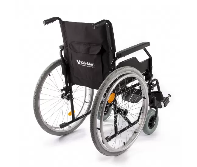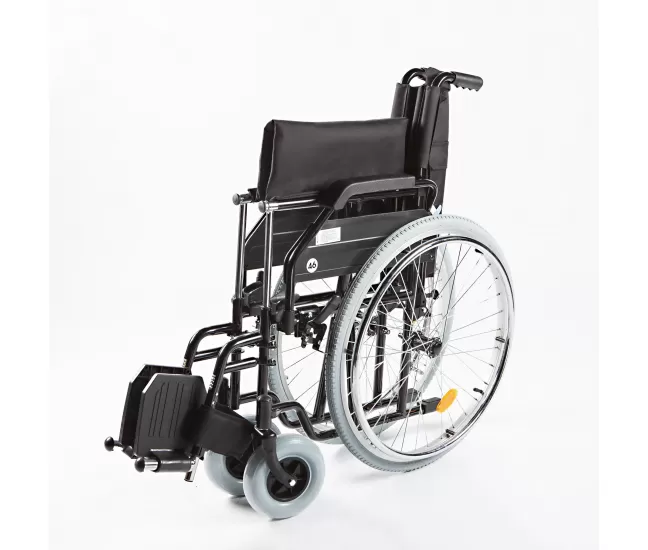 Конструкция этого устройства для передвижения выполнена из металла, окрашенной с крестом, поэтому коляску легко складывать и транспортировать. Ширина сложенной коляски составляет всего 26 см, высота спинки — 40,5 см, а глубина сиденья — 41 см. Сиденье и спинка коляски покрыты мягкой подкладкой. Подлокотники можно опустить и снять с помощью защёлок, расстояние между подлокотниками и сиденьем составляет 22 см. Съемные, поворотные в стороны, регулируемые по высоте подножки для ног с съёмным ремнём для икры. Задние колёса с быстрой фиксацией ненадувные, приводные дуги и диски — из алюминия. Размер передних колёс — 20x5 см, размер задних — 61 см. Спокойные тормоза — с обеих сторон инвалидной коляски. Коляска включает: отражатели, ключ регулировки, инструкции по эксплуатации и обслуживанию на литовском, английском и других языках.