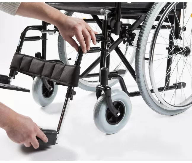 Универсальная, надёжная и надёжная, инвалидная коляска STEELMAN START предназначена для людей весом до 120 кг с временными или долгосрочными проблемами подвижности. Коляску можно использовать как в помещении, так и на улице, двигаясь независимо за счёт вращения металлических приводных дуг, расположенных рядом с задними колёсами. При необходимости тележку может приводить в движение сотрудник с помощью рычагов, установленных над спинкой.