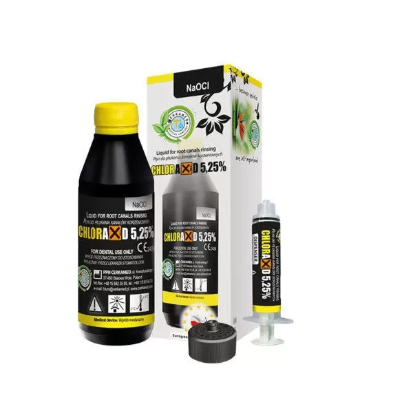 Šķidrums sakņu kanālu skalošanai Hloraksīds 5,25%, 200 gNoņem mirušās celulozes paliekas kanālu mehāniskās izplatīšanas laikā.