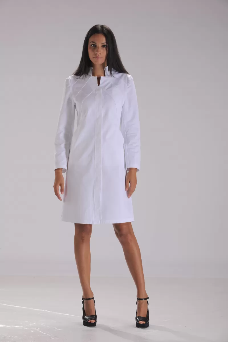 Stils: elegants, piegulošs halāts ar divām kabatām un vienu pildspalvas kabatiņu, viegls, ērts un izturīgs.